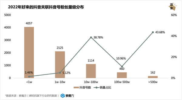 2022年好来的抖音关联抖音号粉丝量级分布