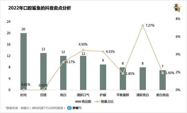 值得注意的是,虽然打着“口腔健康”相关概念的产品在2022年增速迅猛,但其总销售额加起来占比却不算高。