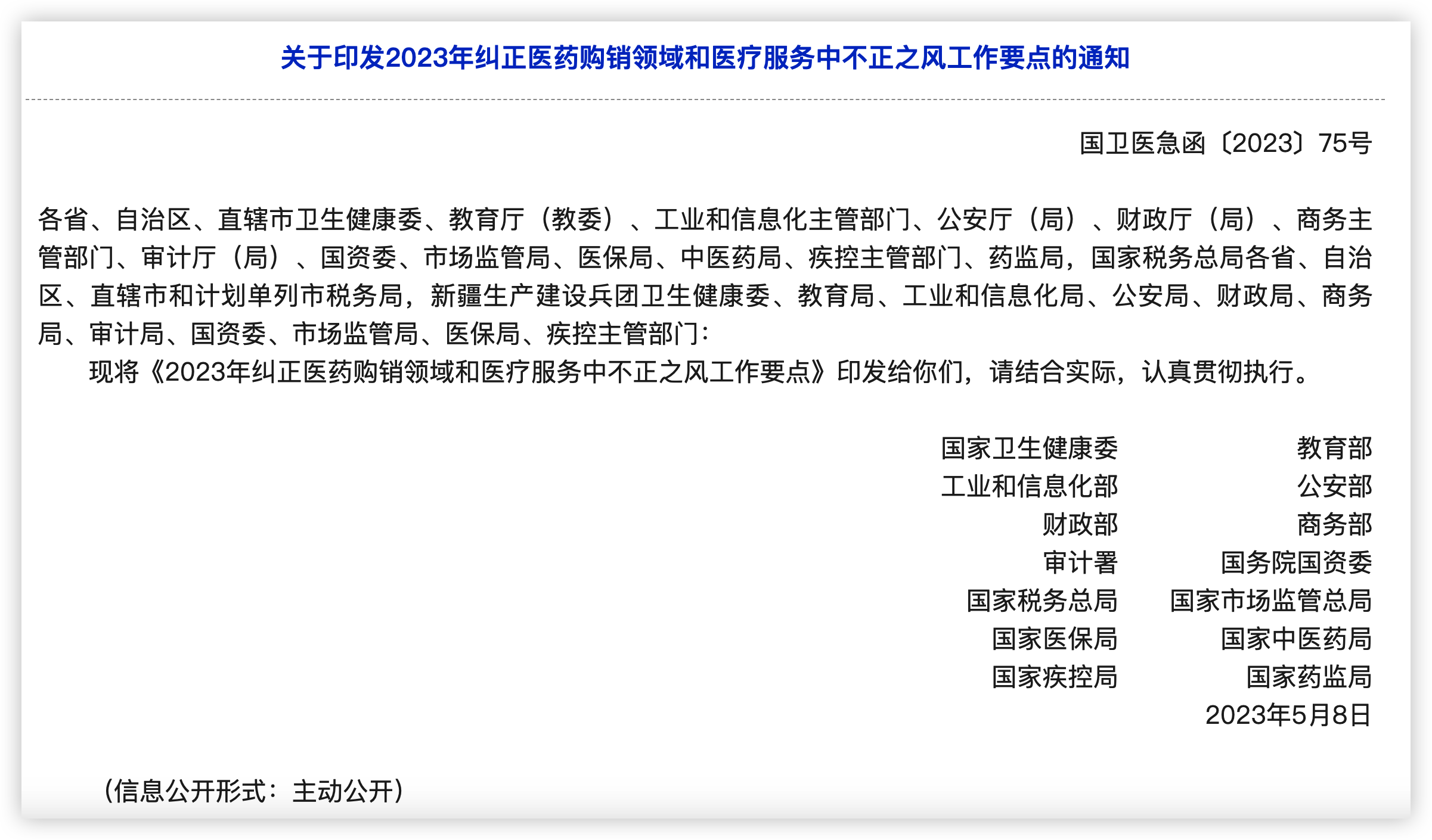 近期,国家卫生健康委员会、教育部、工业和信息化部、公安部、财政部、商务部、审计署、国务院国有资产监督管理委员会、国家税务总局、国家市场监督管理总局、国家医疗保障局、国家中医药管理局、国家疾病预防控制局、国家药品监督管理局等部委联合印发了《关于印发2023年纠正医药购销领域和医疗服务中不正之风工作要点的通知》(国卫医急函〔2023〕75号,以下简称“《通知》”)。